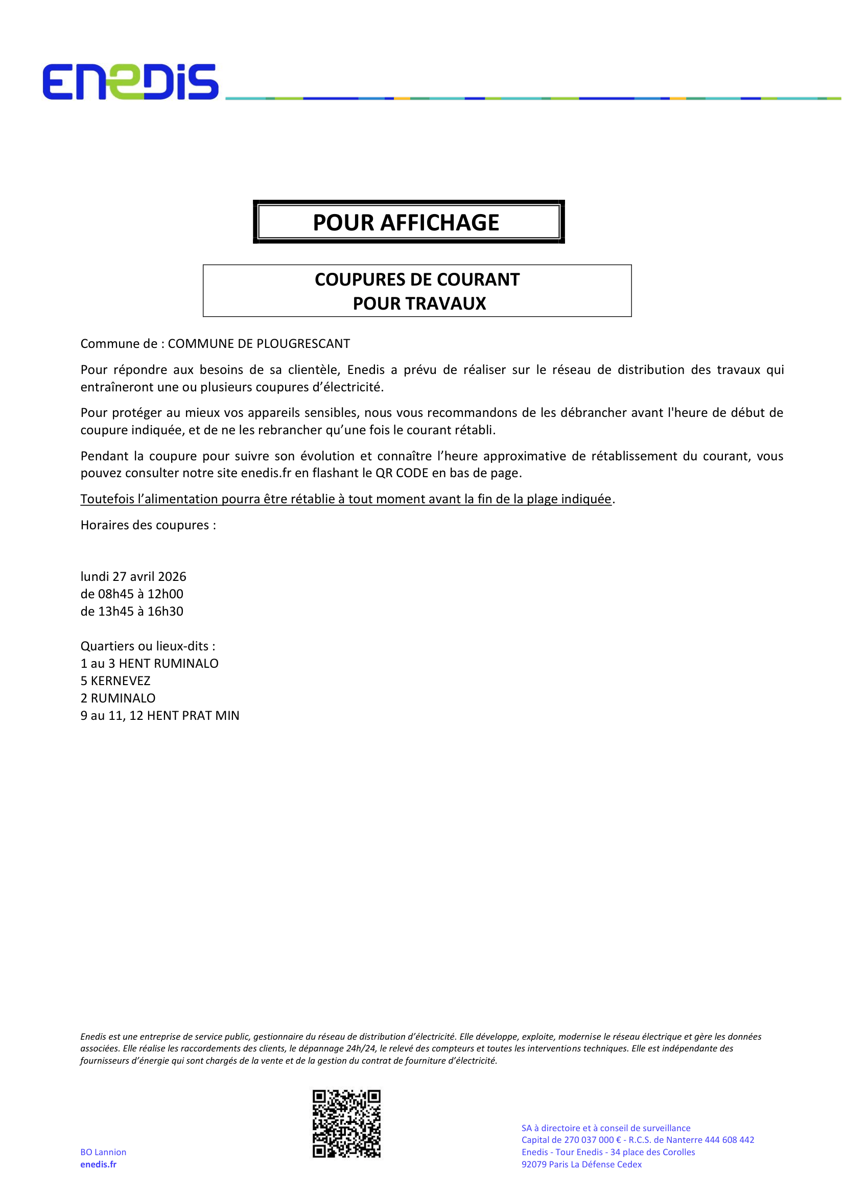 Actualités MairieActualités Vie QuotidiennePage Accueil ⚠️ COUPURE ENEDIS : Lundi 27 avril 6 avril 2026 Communications