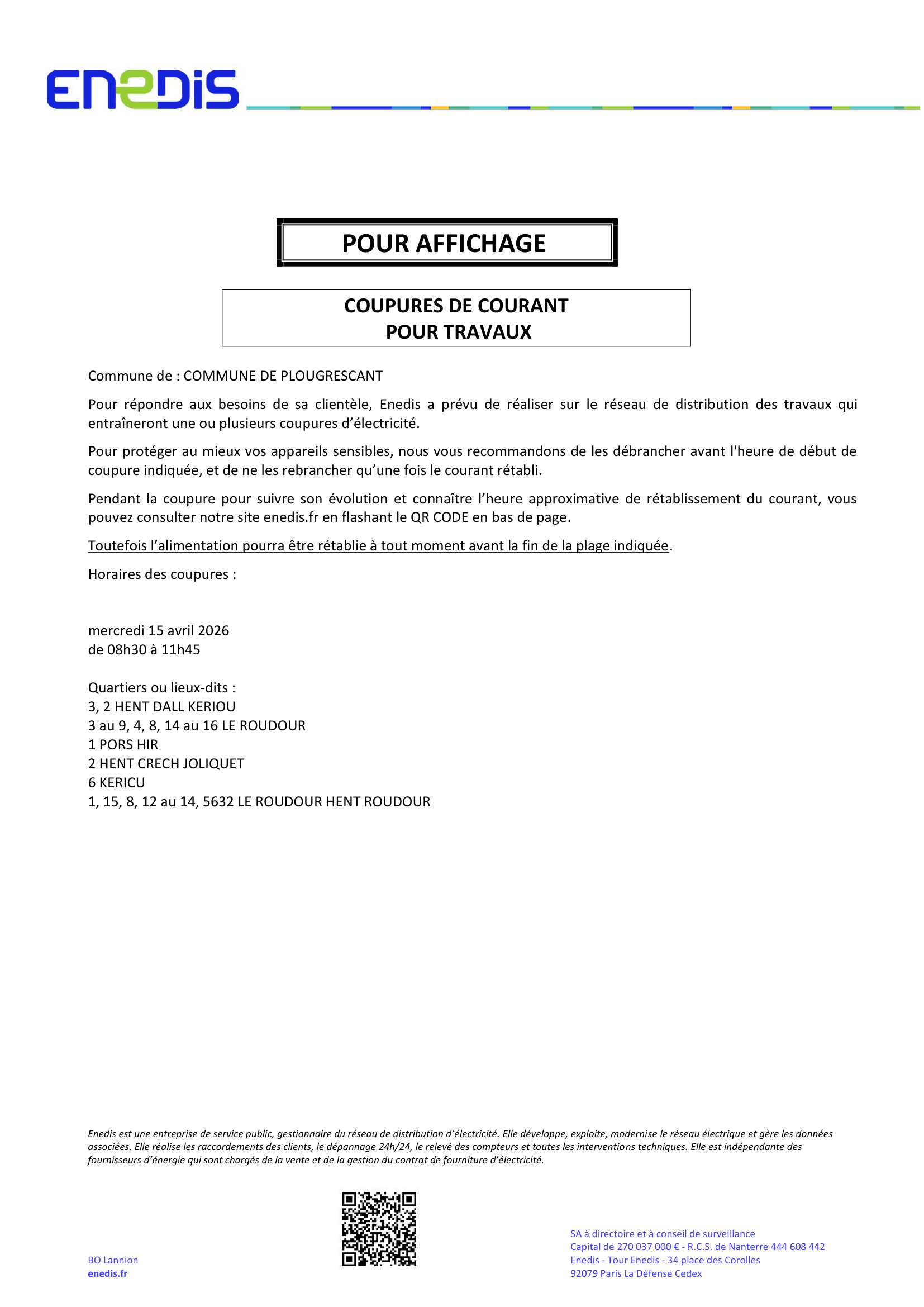 Actualités MairieActualités Vie QuotidiennePage Accueil ⚠️ COUPURE ENEDIS : Mercredi 15 avril 14 avril 2026 Communications