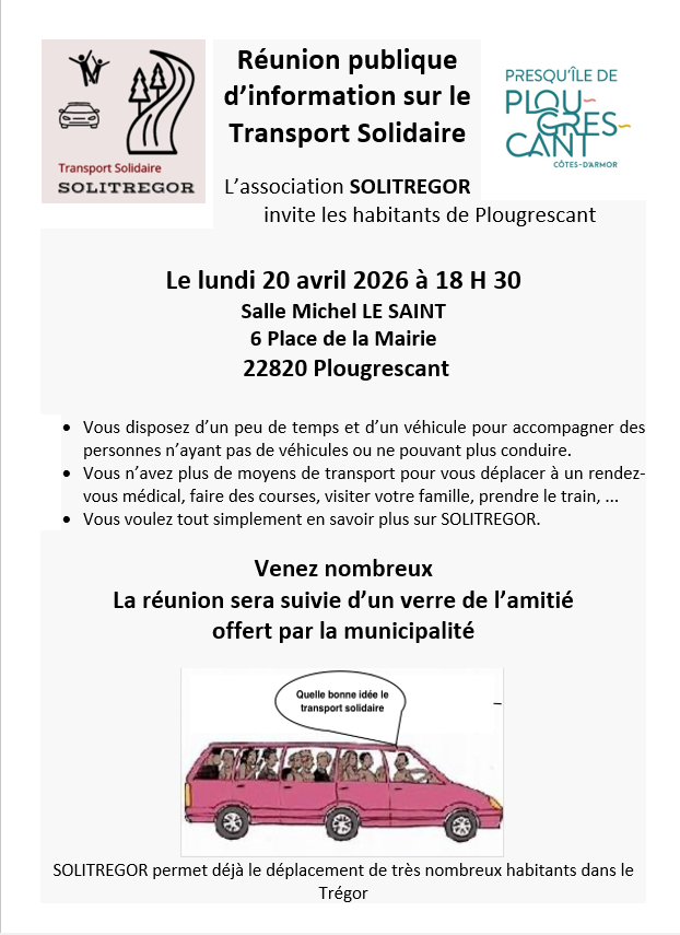 L’association SOLITREGOR convie les habitants de Plougrescant à une réunion publique d’information consacrée au dispositif de transport solidaire.