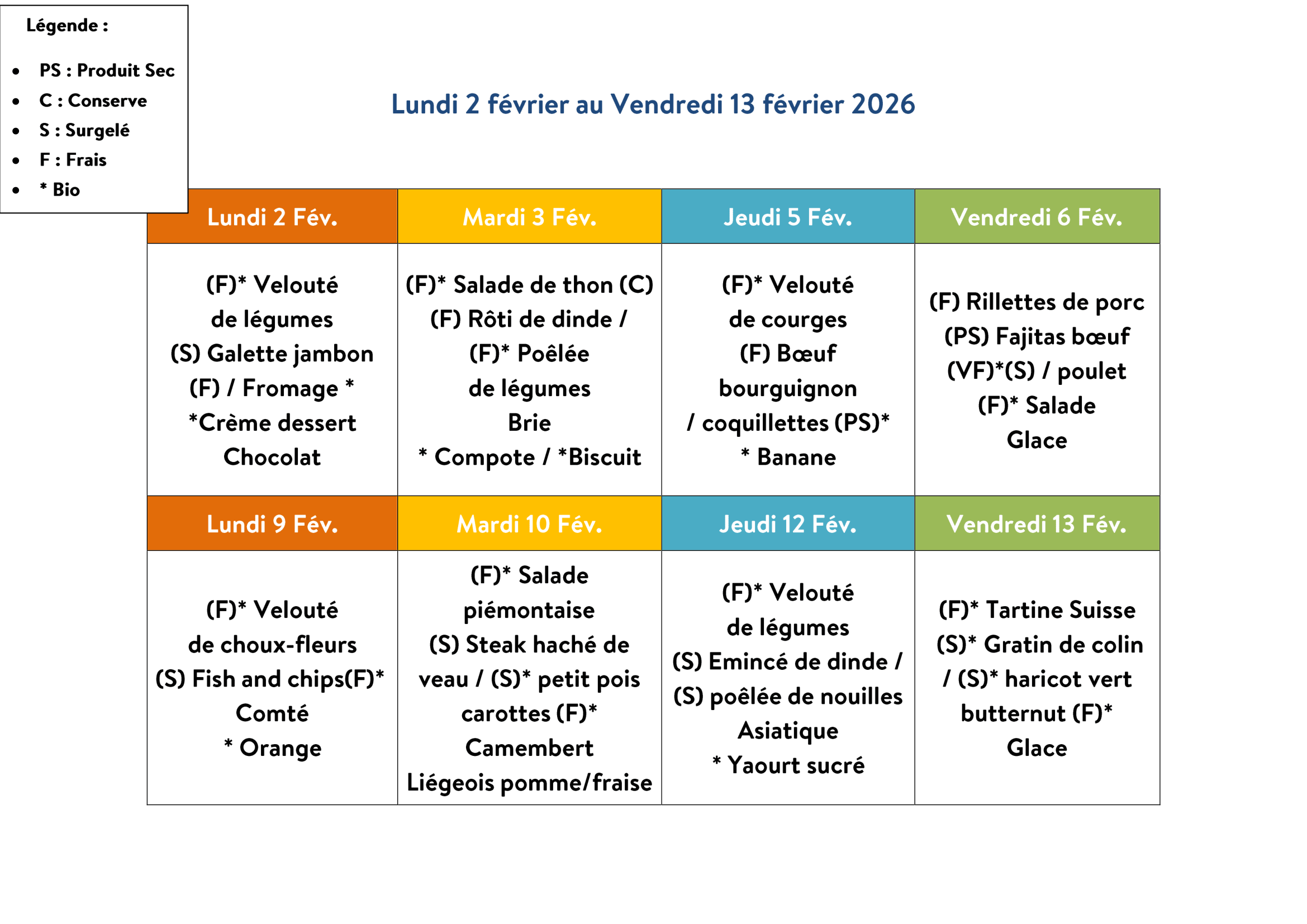 Menus de la cantine pour le mois de Février 2026