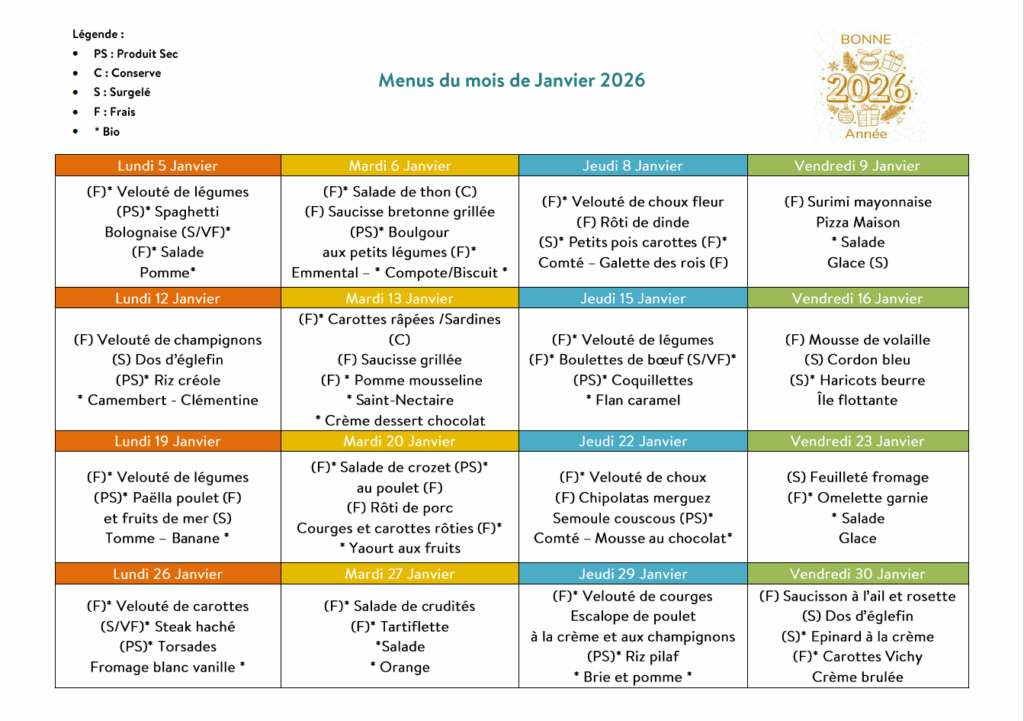Menus du 5 Janvier au 30 Janvier 2026